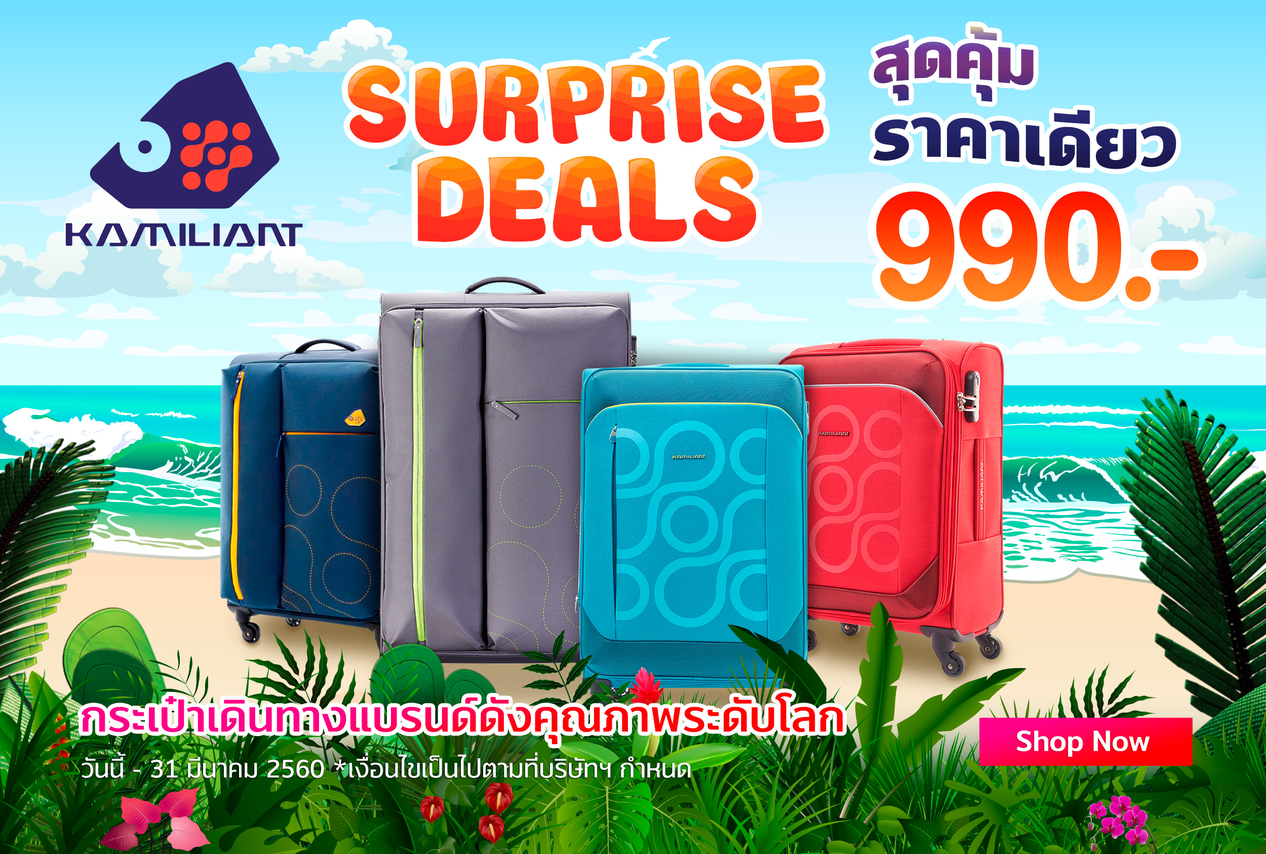 KAMILIANT กระเป๋าเดินทางแบรนด์ดังดีไซน์ทันสมัย คุณภาพระดับโลก พร้อมให้คุณออกเดินทางไปทั่วโลก ด้วยราคาสุดคุ้ม 990 บาท ราคาเดียว ผลิตจากวัสดุคุณภาพ ปลอดภัยด้วยระบบล็อคมาตรฐานสากล อย่ารอช้า คลิกซื้อเลย แล้วไปพักร้อนกันให้สบายใจ ตั้งแต่วันนี้ – 31 มีนาคม 2560 *เงื่อนไขเป็นไปตามที่บริษัทฯ กำหนด