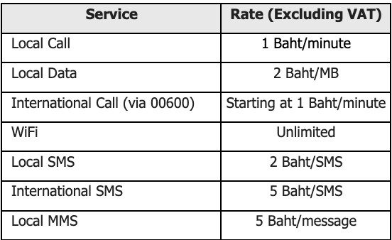 - Unlimited calls to all Thai networks (limited to 15 minutes per call).