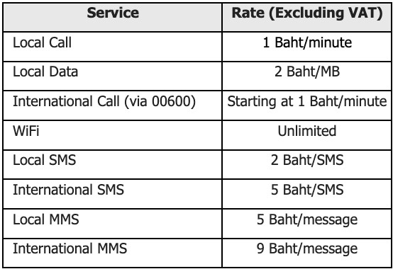 - 10, 20, 50, 150, or 300 Baht provides 30 days of validity