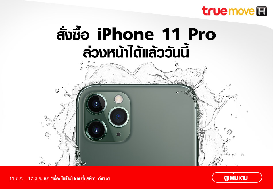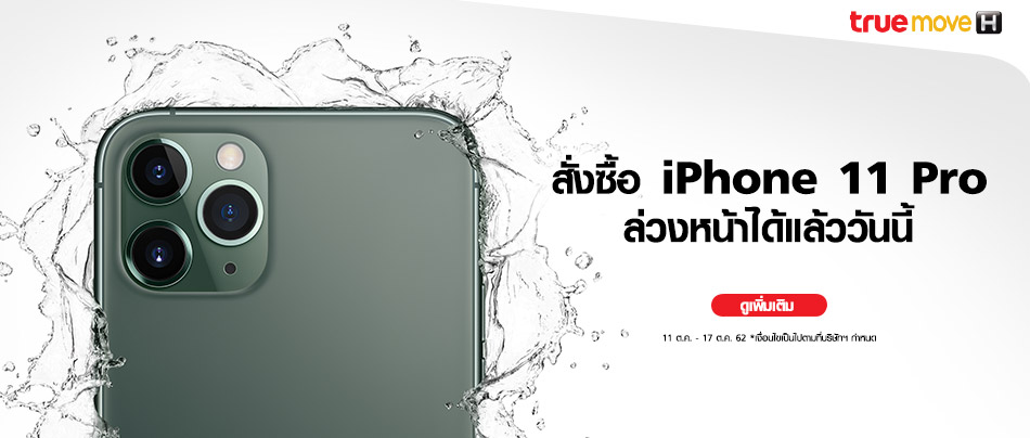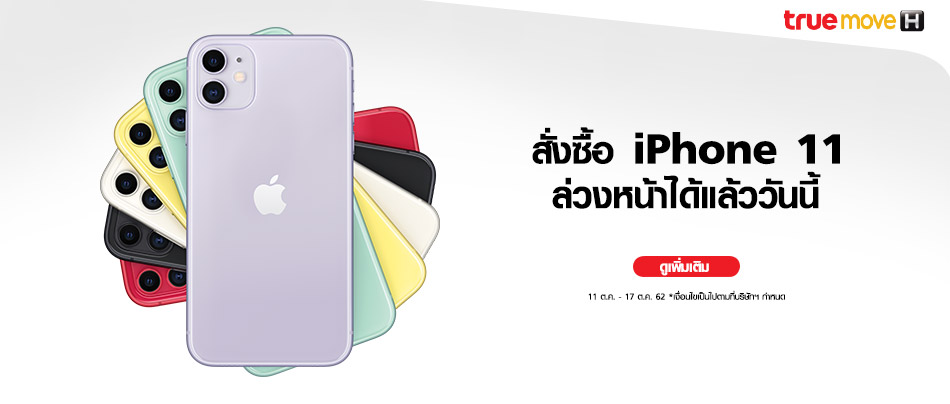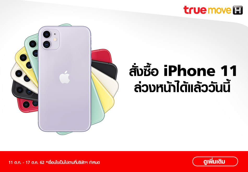 - ลูกค้าที่มีสิทธิสั่งซื้อเครื่องจะต้องเป็นบุคคลธรรมดาที่มีอายุตั้งแต่ 18 ปีบริบูรณ์ขึ้นไป หรือนิติบุคคล/ร้านค้าโดยทำรายการสั่งซื้อผ่านเวปไซต์ www.truemoveh.com/iPhone11/preorder หรือผ่านช่องทางทรูช้อปสาขาที่ร่วมรายการ หรือ https://store.truecorp.co.th หรือ https://www.wemall.com/iphone11-prebooking
