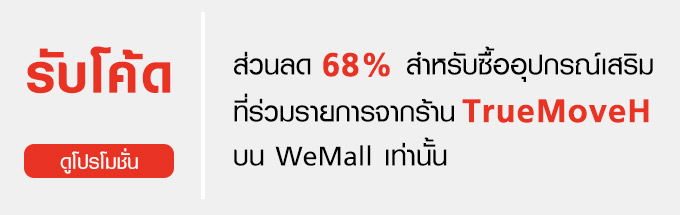 - เฉพาะลูกค้าที่สั่งจองเครื่อง iPhone 11 Pro Max, iPhone 11 Pro และ iPhone 11 ผ่าน https://www.wemall.com/iphone11-prebooking ระหว่างวันที่ 11 ตุลาคม ถึง 17 ตุลาคม พ.ศ. 2562 จะได้รับสิทธิส่วนลดสูงสุด 68% สำหรับซื้ออุปกรณ์เสริมที่ร่วมรายการบนร้าน TrueMove H ที่ WeMall ตั้งเเต่วันที่ 18 ตุลาคม 2562 ถึง 30 พฤศจิกายน 2562 โดยโค้ดส่วนลดเเละรายการสินค้าที่ร่วมรายการจะส่งเข้าอีเมลที่ลูกค้าทำรายการสั่งซื้อภายใน 10 วันหลังจากสถานะการสั่งซื้อเปลี่ยนเป็น "จัดส่งสำเร็จ" หรือ "คุณได้รับสินค้าเรียบร้อยแล้ว"